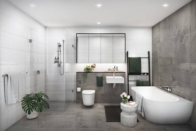 - 所有公寓的起居区及浴室均铺有 600 x 600 mm的仿石灰岩地砖,增加室内的空间感